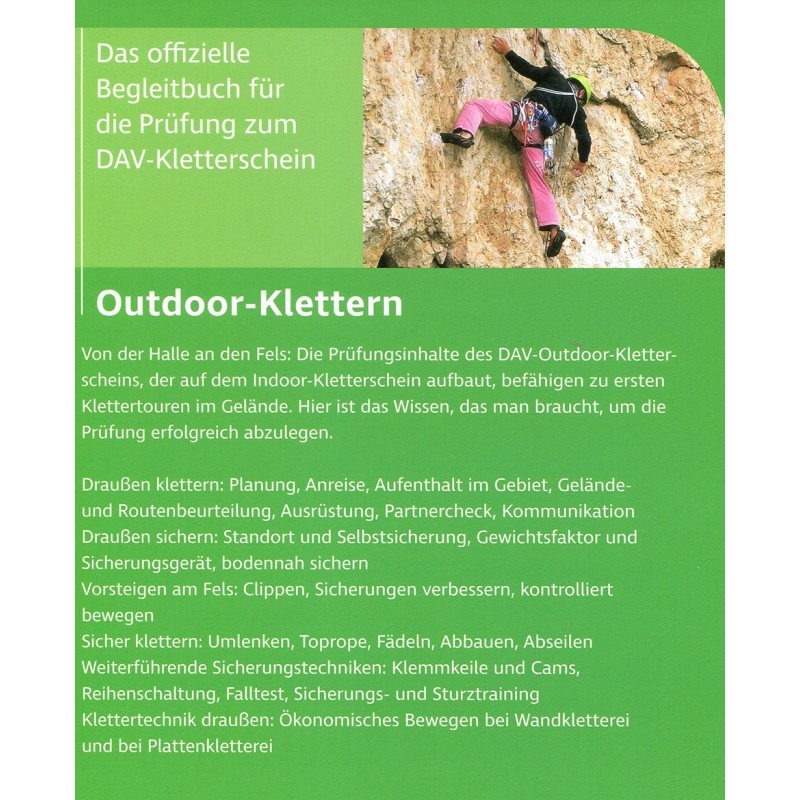 Dieses Buch bildet die ideale Pr?fungsvorbereitung f?r den DAV Outdoor-Kletterschein, aber es ist auch eine Fundgrube an Wissen f?r alle die den Schritt von der Kletterhalle an den Fels wagen m?chten. Somit gibt dieses Buch auch Kletterern, die nicht unbedingt einen Kletterschein erwerben wollen, viele hilfreiche Tipps, was drau?en am Fels und in der Natur zu beachten ist. Kapitel ?ber Ausr?stung, Vorsteigen am Fels, Umlenken, Abbauen und Abseilen. Klettertechniken sowie weiterf?hrende Sicherungsstechniken sind durch Schritt-f?r-Schritt-Anleitungen und Grafiken vor allem f?r Anf?nger leicht verst?ndlich. Die abschlie?ende ?bersicht fasst noch einmal die Rahmenbedingungen f?r den Kurs und die Pr?fung sowie die Bestandteile des Pr?fungsprotokolls zusammen.